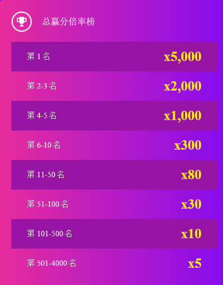 在活动期间,记录每个玩家所打出的"单场"赢分倍率,全数加总后 进行排名,根据上榜名次对应的奖励倍数,乘以最大赢分倍率场次的押注额并给予奖金!总奖项每日4,000个。一日一期,每日结算比赛奖金,并以最大赢分倍率场次之押注额计算奖金,感恩回馈彩金大放送!